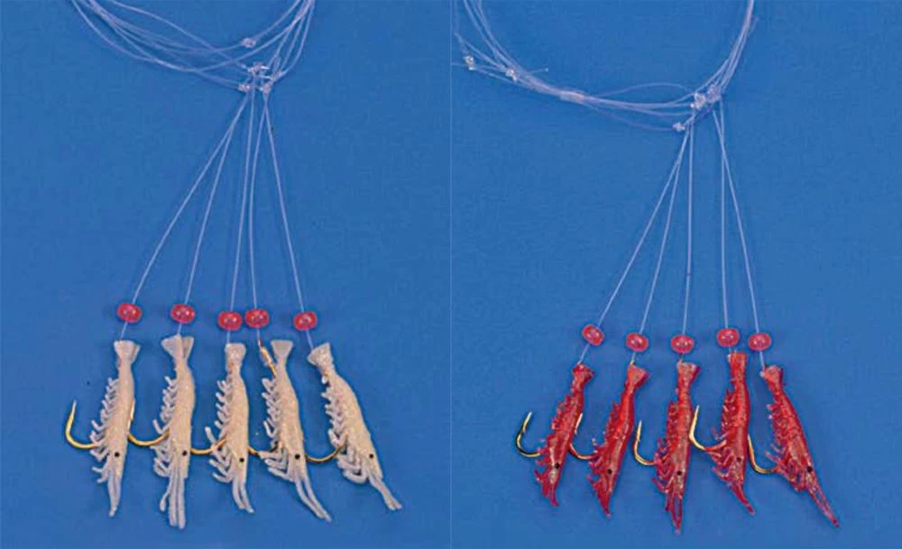 Dieses Vorfach-System besitzt 5 Goldhaken, die mit Mini-Shrimps verziert sind. Über den Haken sind rote Perlen befestigt. Die Haken haben eine Größe von 2. Der Schnurdurchmesser ist 0,40mm stark, bei einer Vorfachlänge von ca. 1,40m. Es stehen zwei verschiedene Farben zur Auswahl.