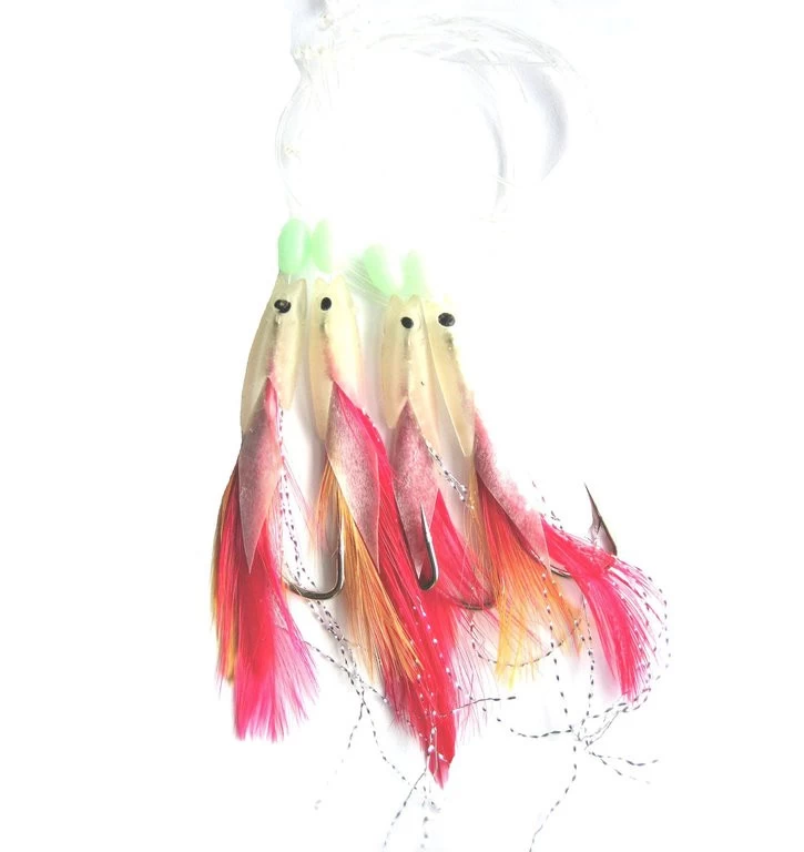 Dieses handgebundene Vorfach, mit selbstleuchtenden Lockperlen und kleinen Fischimitationen mit Tinsel, ist 1,40m lang. Es besteht aus 0,45mm starker monofiler Schnur und Haken der Größe 3/0. Es gibt drei verschiedene Farbvarianten, die sich in der Farbe der Tinsel unterscheiden.