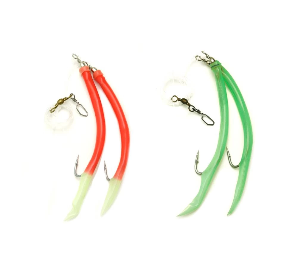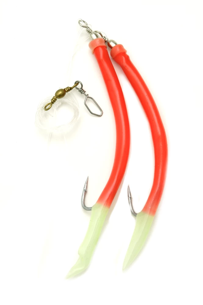 Dieses Vorfach gibt in den gängigen Größen von 6/0 bis 12/0. Es stehen die Farben Fluo-Rot mit Luminous-Spitze und Fluo-Selbstleuchtend zur Verfügung. Das Vorfach ist ca. 1m lang und besteht aus 2 Gummi-Makks, die an einer 0,75mm starken Mundschnur befestigt sind. Die Hauptschnur hat einen Durchmesser von 0,85mm.