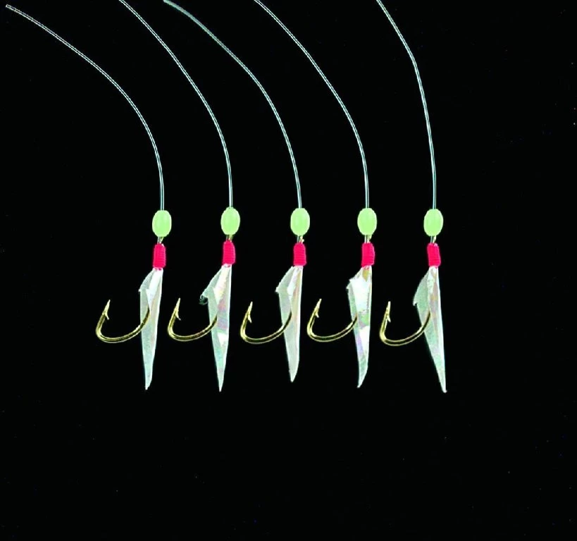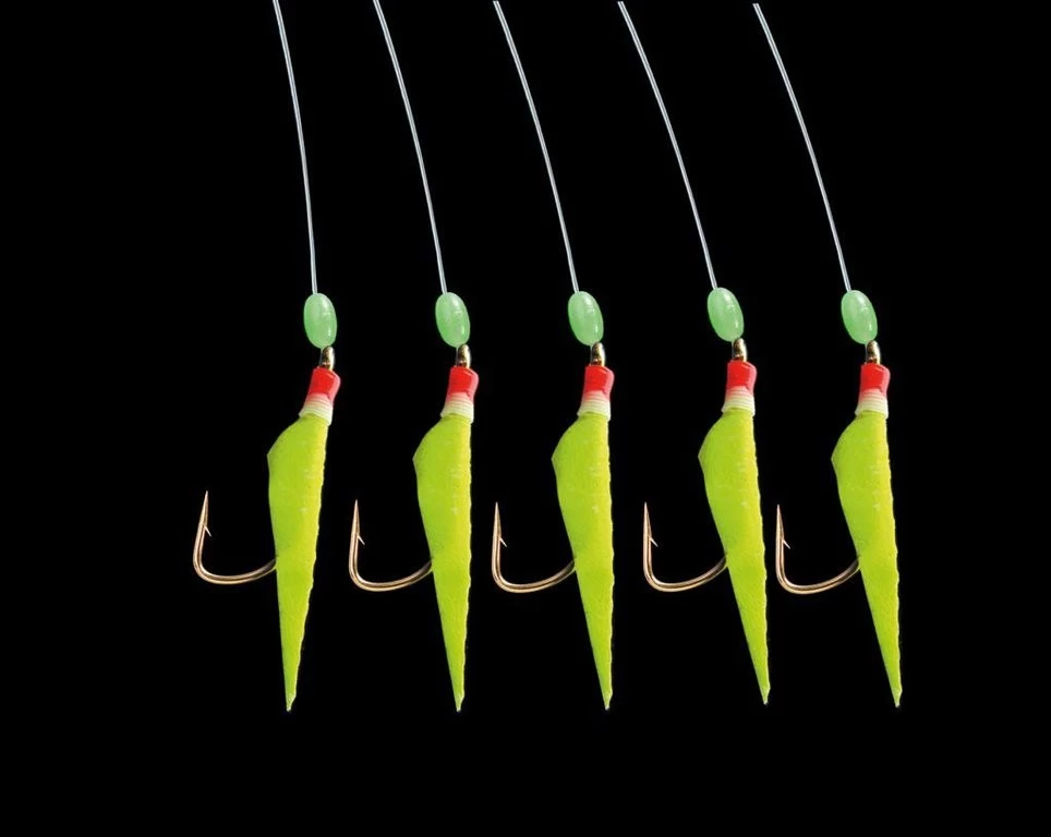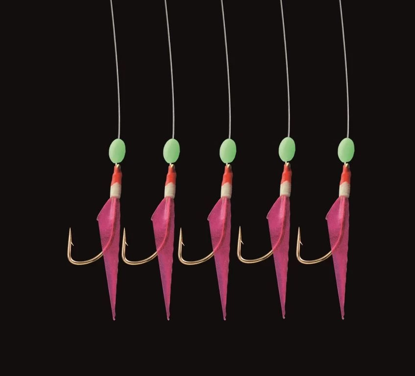 Es gibt dieses Rig in drei Varianten, einmal mit echter Fischhaut (weiß) bzw. mit gelben oder blauen Fischhautimitat. Die 5 goldenen Haken haben die Größe 3. Die Hautschnur ist 0,60mm stark und die Seitenarme 0,45mm. Ideal zum Heringsfang.