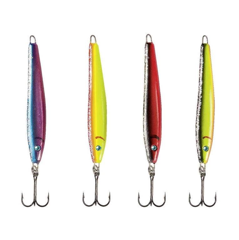 Dieser Pilker ist ein sehr beliebtes Modell mit traditioneller Form, der seine tolle Fängigkeit über die Jahre hinweg nicht verloren hat. Die klassische Form sorgt für taumelndes Sinkverhalten. Bei Insidern ist er sehr geschätzt. Es stehen 4 verschiedene Farbvariationen mit einer Glitzer-Nuance auf der Rückenseite und stark reflektierenden silberfarbenen Diamant-Augen zur Verfügung. Es gibt drei Gewichte von 60g – 100g.