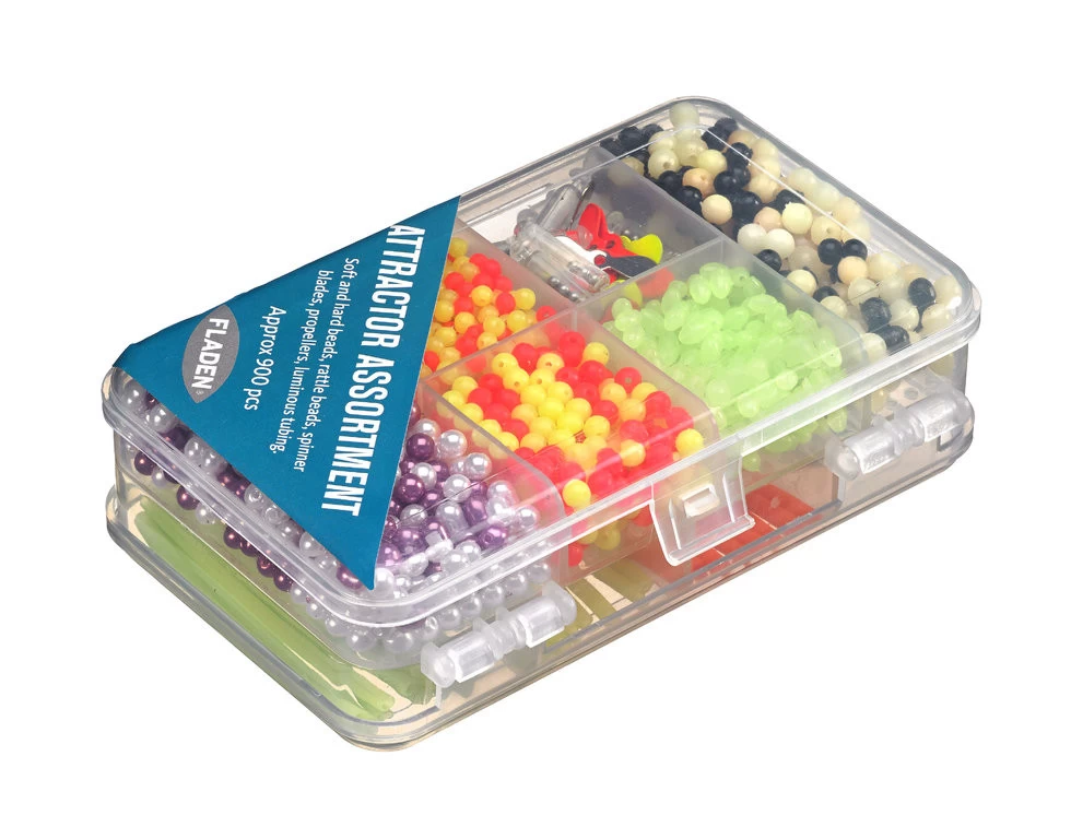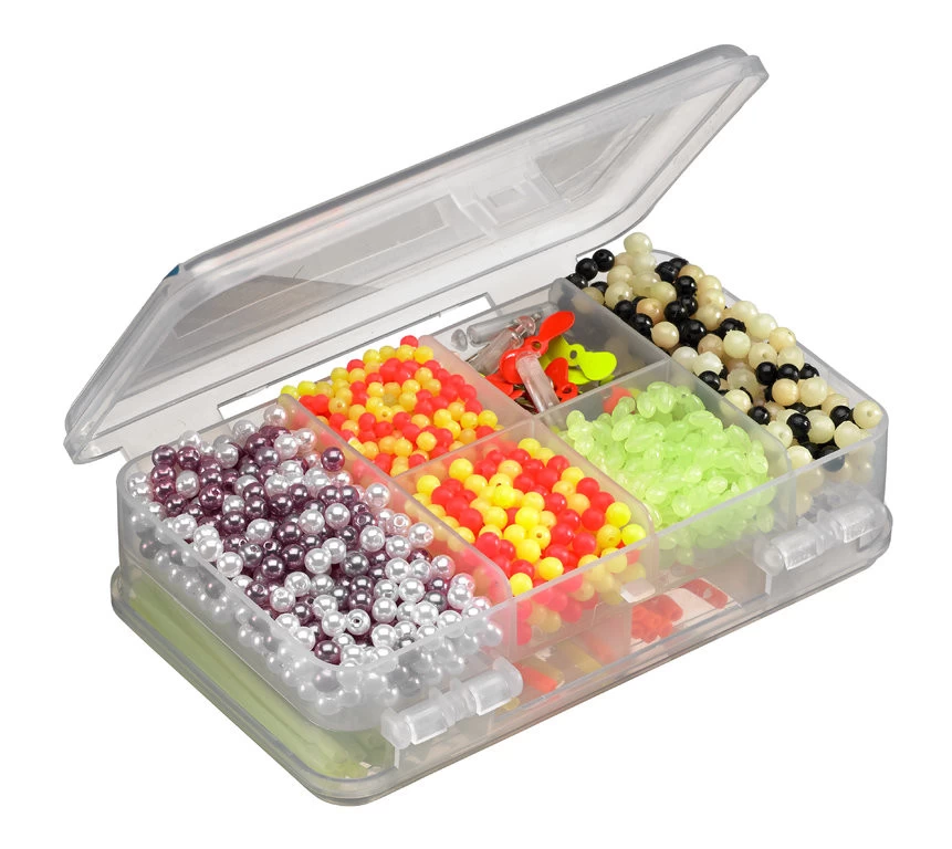 Diese Vorfachzubehör wird in einer einer praktischen Klarsichtbox geliefert, welche von beiden Seiten geöffnet werden kann. Dieses Sortiment enthält ca. 900 Teile. Es sind verschiedene harte und weiche Perlen, Spinnerblätter, Propeller, Leuchtschläuche und Rasseln enthalten. Diese Box lässt fast keine Wünsche offen.