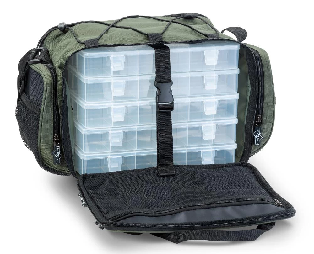 Mit fünf Boxen lässt sich hier eine Menge Tackle unterbringen. Trotzdem kann man diese Tasche noch bequem transportieren. Durch zusätzliche Außen- und Netztaschen sehr praktisch.