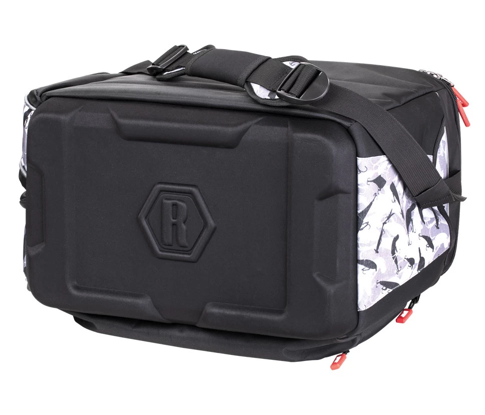 Wasserdichtes Rapala Gewebe im LureCamo-Design und einem geformtem, wasserdichtem EVA-Boden und -Deckel, um das Eindringen voon Wasser zu verhindern. Die Tasche biedet Platz für sieben Tackle-Boxen der Größe 3700 im Inneren der Tasche und eine Achte für schnellen Zugriff auf der Oberseite. Die mehrlagige Fronttasche bietet sicheren Stauraum für Werkzeug, das sich für einen einfachen Zugriff weit öffnen lässt, sowie Reißverschlusstaschen für Vorfächer und Organizer. Weiter besitzt sie D-Ring-Befestigungspunkte auf der Vorderseite, durchsichtige Tasche mit Reißverschluss im Deckel., Neopreneinsätze an den Seitentaschen für zusätzliches Fassungsvermögen, sowie Endtaschen, die auch als Rutenhalter dienen. Sie hat einen gepolsterten, verstellbarer Schultergurt, der zu einem Tragegriff heruntergezogen werden kann.