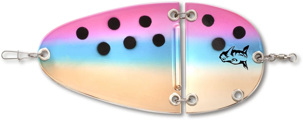 Der K2 Flasher ist der erste zweiteilige Flasher aus dem Hause Rhino. Sein verlockender Lauf wird Blinker- und Naturköderangler gleichermaßen begeistern. Durch seine seitlichen Ausbrüche, gepaart mit unregelmäßigen Drehungen, hat dieser Flasher schon in der Probephase gezeigt, dass er Lachse, Meerforellen und Dorsche zu betören weis. Durch seine einzigartige Bauform macht dieser Flasher im Drill so wenig Druck, dass man das Gefühl hat, man drillt die Fische an der freien Schnur. Ein wahres Drillvergnügen ist sicher. Dieser Flasher ist in sechs verschiedenen Farben verfügbar, wobei die Rückseite abhänig von der Farbe gefärbt ist. Der Flasher ist in einer Länge von 12,5cm oder 18cm verfügbar. Dabei hat er ein Gewicht von 21g bzw. 53g.