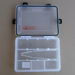 Diese Zubhörbox hat eine Größe von 27,5x18x5cm und verfügt über frei einteilbare Fächer. Ein Dichtungsgummi am Deckelrand sorgt für höhere Wasserdichtigkeit.