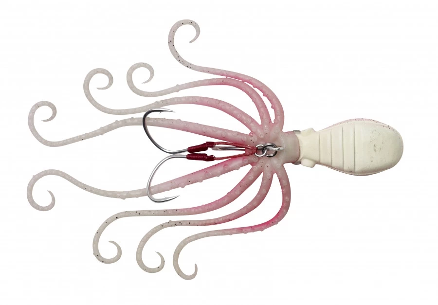 Der 3D Octopus basiert auf dem Scan eines echten Baby Octopus. Der Körper ist aus einer Bleilegierung und die Arme sind aus super haltbarem, aber weichem TPE. Der Köder bietet fast keinen Wasserwiderstand in der Absinkphase und springt beim Slow Jigging weit zur Seite. In Haltephasen hängt der Köder lebensecht im Wasser und die Arme bewegen sich schon bei der geringsten Strömung.