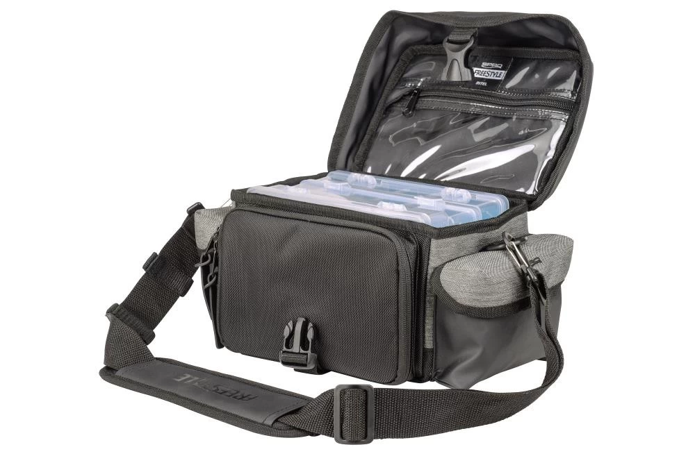 Eine qualitativ hochwertige Tasche für gezielte Kurzsessions. Die Side Bag enthält drei Freestyle Tackleboxen, die von oben leicht zugänglich sind. In der Vordertasche ist ausreichend Stauraum für kleinere Tackleboxen (z.B. Rigged Boxes S und M) und weiteres Zubehör.